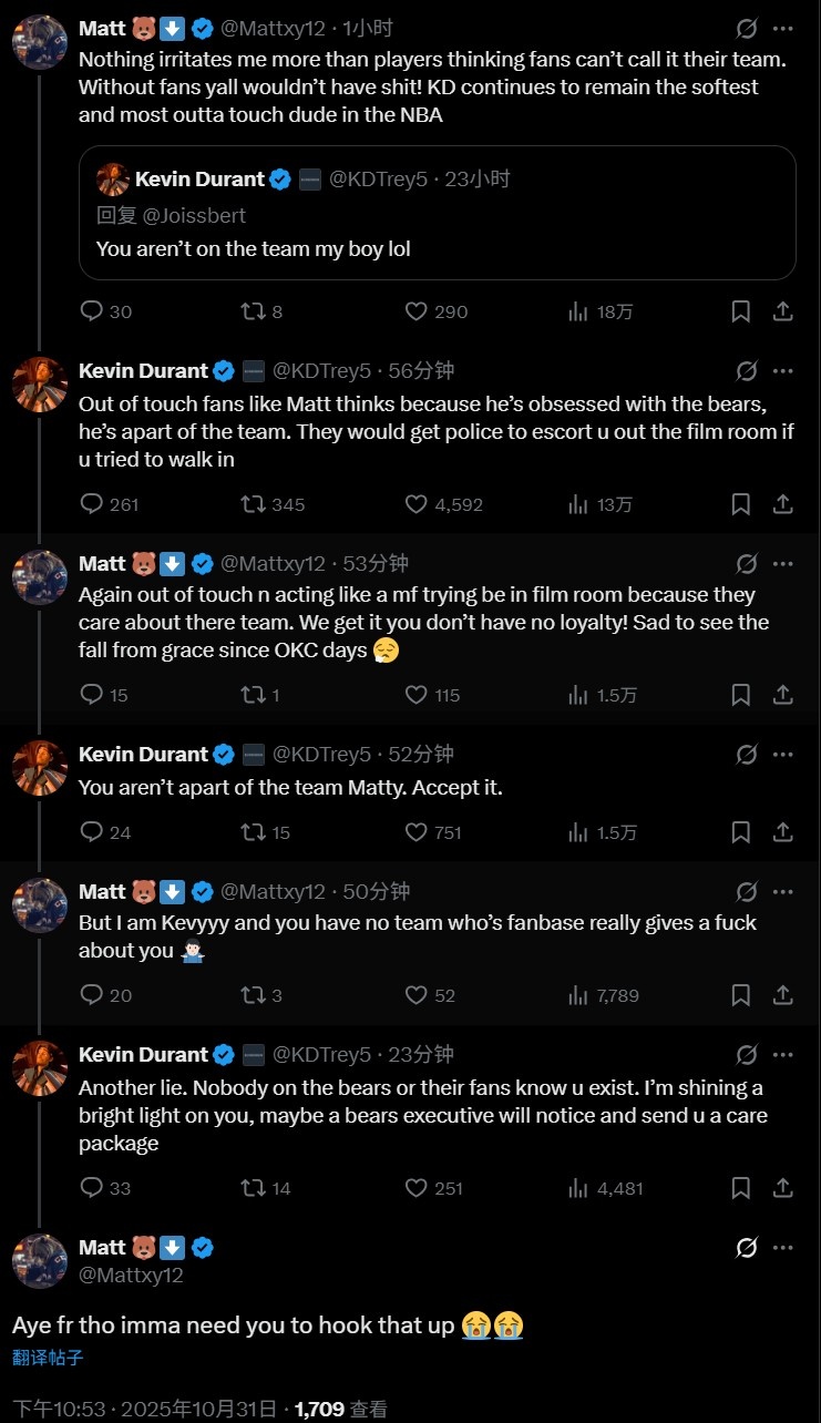 10月31日訊 今日杜蘭特繼續在社媒和網友對線。