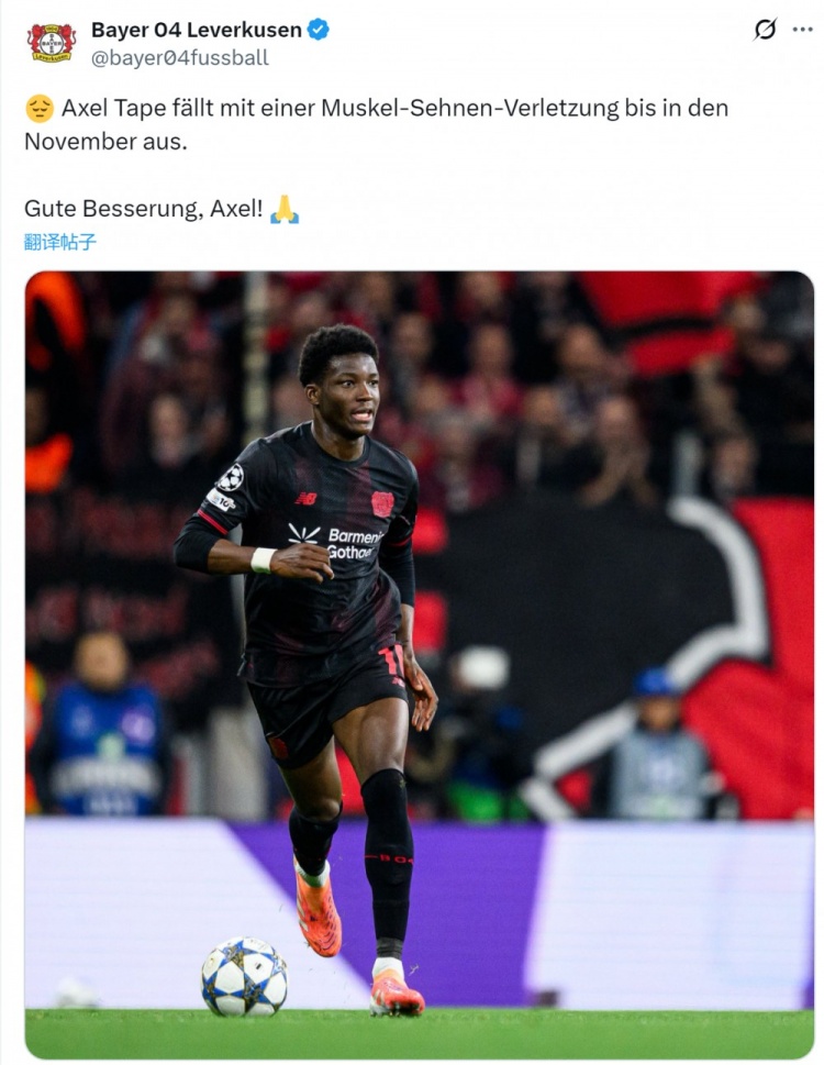 10月3日訊 勒沃庫(kù)森官方確認(rèn),隊(duì)內(nèi)18歲中衛(wèi)塔佩左大腿后側(cè)肌腱受傷,預(yù)計(jì)11月國(guó)際比賽日之后回歸。