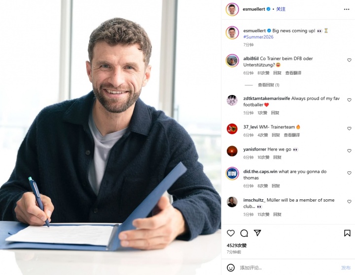 10月10日訊 穆勒今日在社媒更新了一條動態寫道:重磅消息即將揭曉,并帶上#2026夏天#的標簽,引發了球迷們的無限遐想,有球迷在穆勒社媒下猜測他可能會以教練組成員的身份參加2026年世界杯。