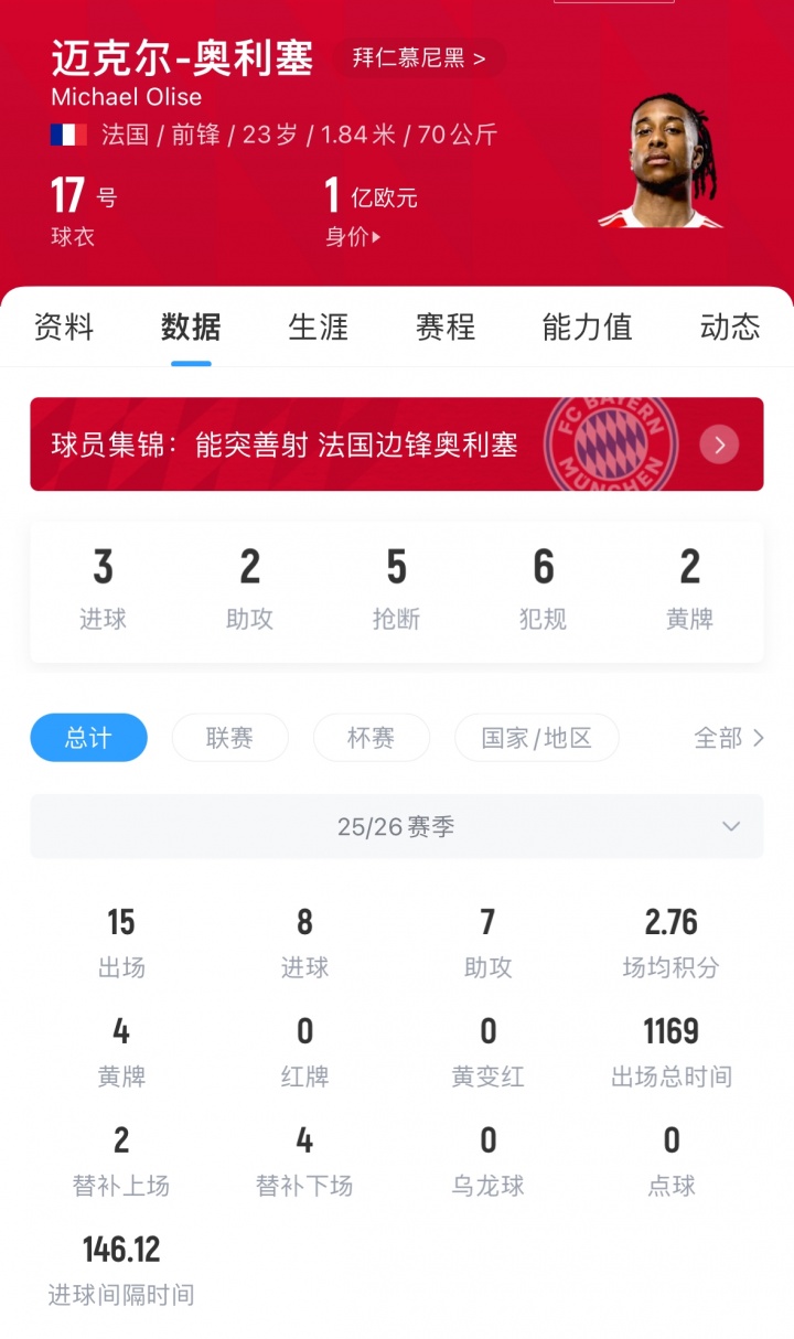 奧利塞現年23歲,司職右邊鋒,他本賽季為拜仁出戰15次,貢獻8球7助,他與拜仁的合同在2029年到期,現身價1億歐。