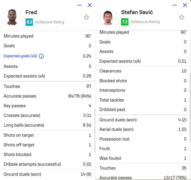 此外,曼聯舊將弗雷德(費內巴切)和曼城舊將薩維奇(特拉布宗體育)也都在本場比賽打滿全場,弗雷德還獲評8.3分全場第二高。