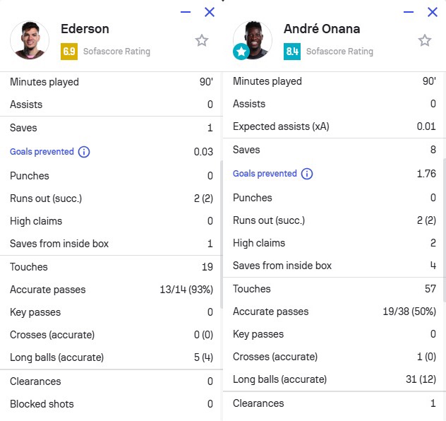 本場比賽,埃德森1次撲救(1次撲救禁區內的射門)、2次成功出擊,19次觸球,5次長傳4次成功,獲評6.9分。奧納納8次撲救(4次撲救禁區內的射門)、2次成功出擊、2次高球攔截,57次觸球,31次長傳12次成功,1次解圍,獲評8.4分全場最高。