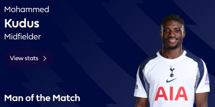 本場比賽熱刺球員庫杜斯發(fā)揮出色,打進一球并且助攻一次,完成6次過人,賽后他也當選