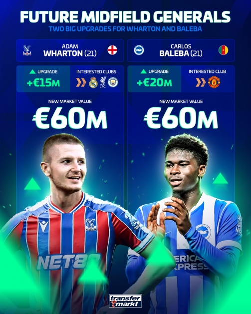10月17日訊 德轉(zhuǎn)今日更新英超身價,其中巴萊巴和沃頓都得到了大幅提升,漲至6000萬歐。沃頓本次的漲幅是1500萬歐,巴萊巴漲幅是2000萬歐。